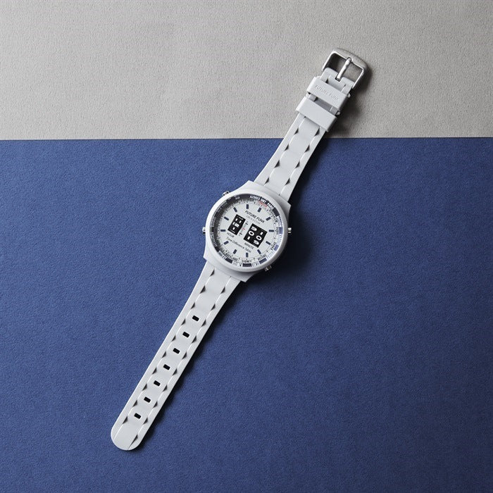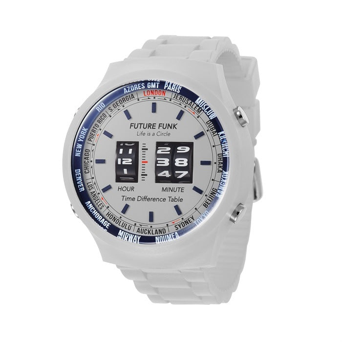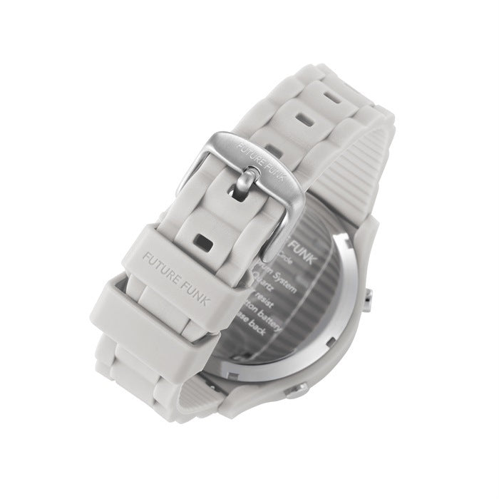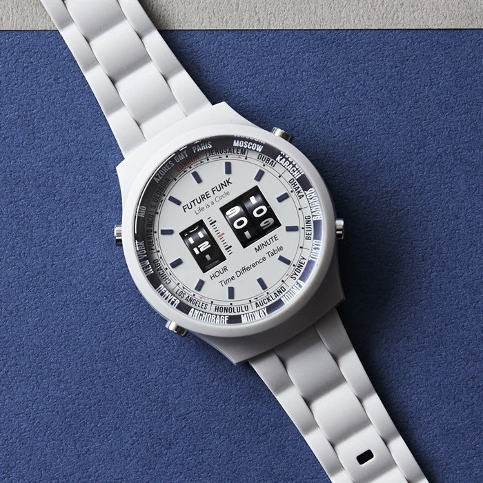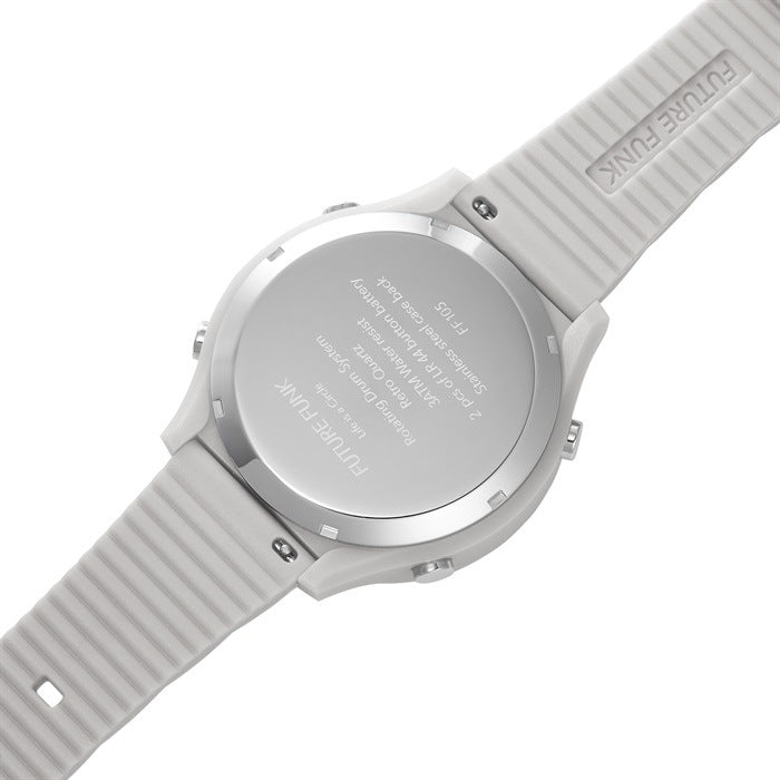 A new plastic model based on the retro color concept of the 1970s and 1980s is now available in the FUTURE FUNK roller wristwatch! This is a new series with an inner ring printed with the names of major cities around the world, in keeping with the atmosphere of the time. By using plastic material for the case, we succeeded in reducing the weight by approximately 25% compared to conventional stainless steel cases. The soft polyurethane belt is comfortable to wear and allows you to enjoy FUTURE FUNK in a more fun and casual way.