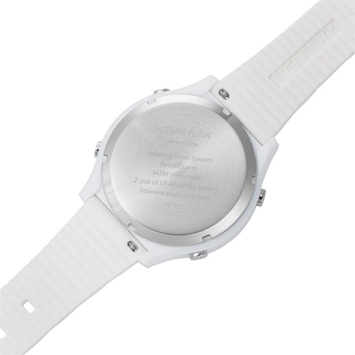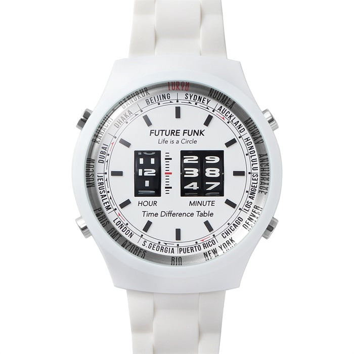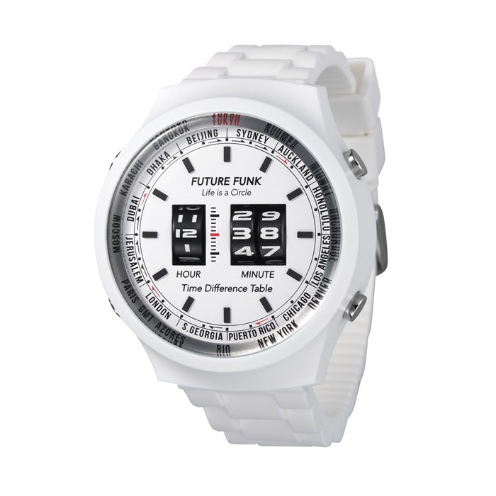 A new plastic model based on the retro color concept of the 1970s and 1980s is now available in the FUTURE FUNK roller wristwatch! This is a new series with an inner ring printed with the names of major cities around the world, in keeping with the atmosphere of the time. By using plastic material for the case, we succeeded in reducing the weight by approximately 25% compared to conventional stainless steel cases. The soft polyurethane belt is comfortable to wear and allows you to enjoy FUTURE FUNK in a more fun and casual way.