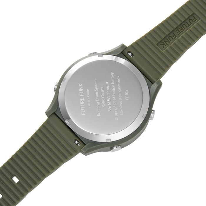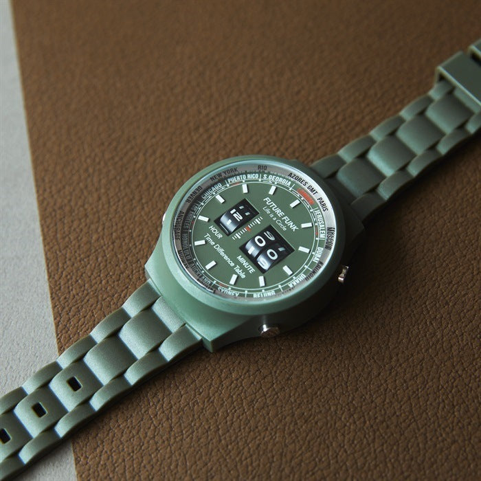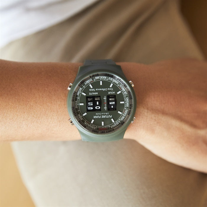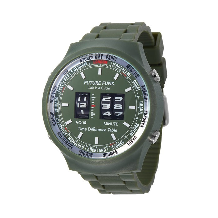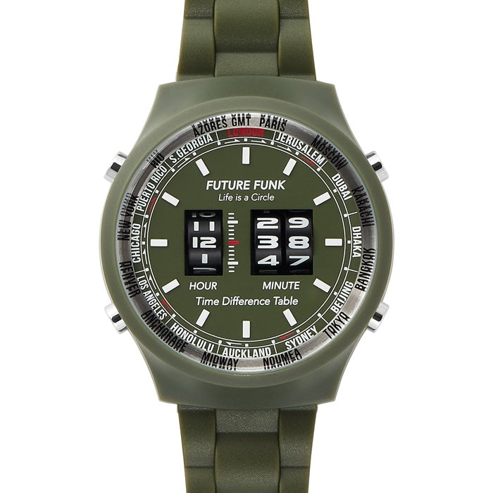 ローラー式腕時計FUTURE FUNKに、1970-1980年代のレトロカラーをコンセプトにしたプラスティックモデルが新登場!世界の主要都市名がプリントされたインナーリングを当時の雰囲気そのままにあしらった、こだわりの新シリーズです。ケースにプラスティック素材を採用することで、従来のステンレススティールケースに比べて約25%の軽量化に成功。柔らかいポリウレタン製のベルトは着け心地が良く、より楽しくカジュアルにFUTURE FUNKをお楽しみいただけます。